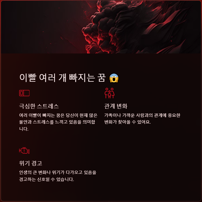 - ❌ 이빨이 빠지고 피가 나는 꿈? → 현실에서도 감정적으로 힘든 일이 있을 가능성!